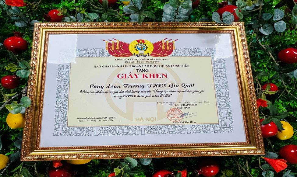 Hội nghị cũng đã khen thưởng cho 20 tập thể có bài tham gia dự thi đạt chất lượng cuộc thi "Sáng tạo Video clip bài tập thể dục giữa giờ trong CNVCLĐ toàn quốc năm 2022”. Trong đó, bài tập thể dục “Vươn cao Phù Đổng” của Công đoàn Trường THCS Gia Quất vinh dự được là một trong bốn Công đoàn khối THCS được khen thưởng. Đây là tin vui đầu tiên đến với Công đoàn trường kể từ khi thành lập. Xin chúc mừng những thành tích đã đạt được của Công đoàn Trường THCS Gia Quất. Chúc Công đoàn trường tiếp tục phấn đấu đạt nhiều thành tích cao hơn nữa trong thời gian tới!