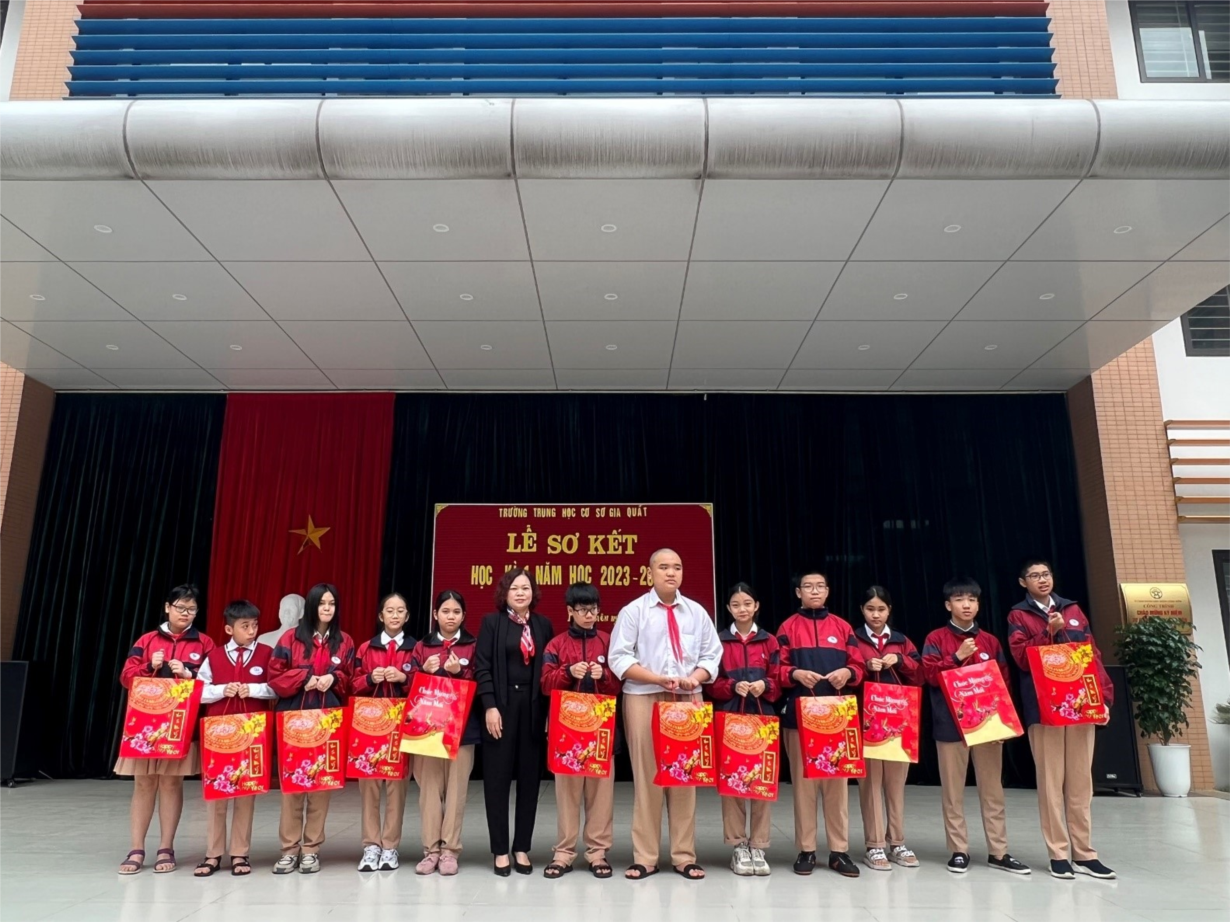 Cũng tại buổi lễ, nhà trường cũng đã có những món quà trao tặng tới các em học sinh có hoàn cảnh khó khăn vươn lên trong học tập, rèn luyện nhân dịp Tết Nguyên đán. Món quà nhỏ như một lời động viên, lời chúc các em đón một năm mới nhiều niềm vui, đạt thành tích cao hơn nữa trong học tập.