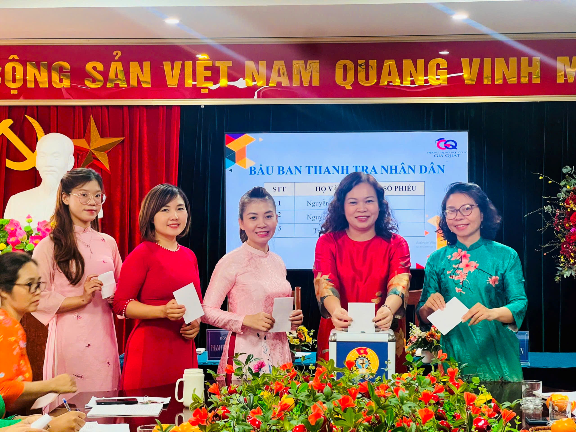 Với 100% ý kiến nhất trí, Hội nghị tiến hành bầu đoàn chủ tịch gồm 2 đồng chí: đồng chí Lê Kim Tuyến - Bí thư chi bộ, Hiệu trưởng nhà trường; đồng chí Phạm Thị Thanh Bình - Phó bí thư chi bộ, Chủ tịch công đoàn, Phó hiệu trưởng nhà trường và Ban Thư ký Hội nghị gồm 02 đồng chí: Trần Thu Thuỷ, Phạm Minh Anh.