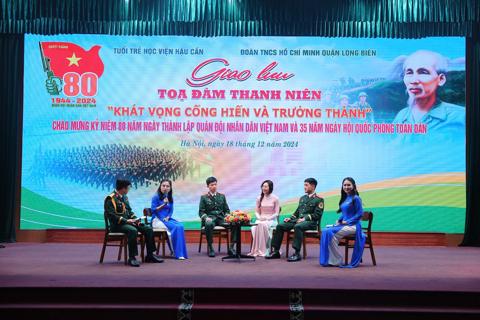 Tới dự giao lưu, tọa đàm có các đồng chí trong Thường vụ Đảng ủy, Ban Giám đốc Học viện Hậu cần, đại biểu Quận ủy Long Biên, đại biểu Thành đoàn Hà Nội, Quận đoàn Long Biên, cán bộ, đoàn viên thanh niên trong Học viện Hậu cần và các đơn vị kết nghĩa trên địa bàn.