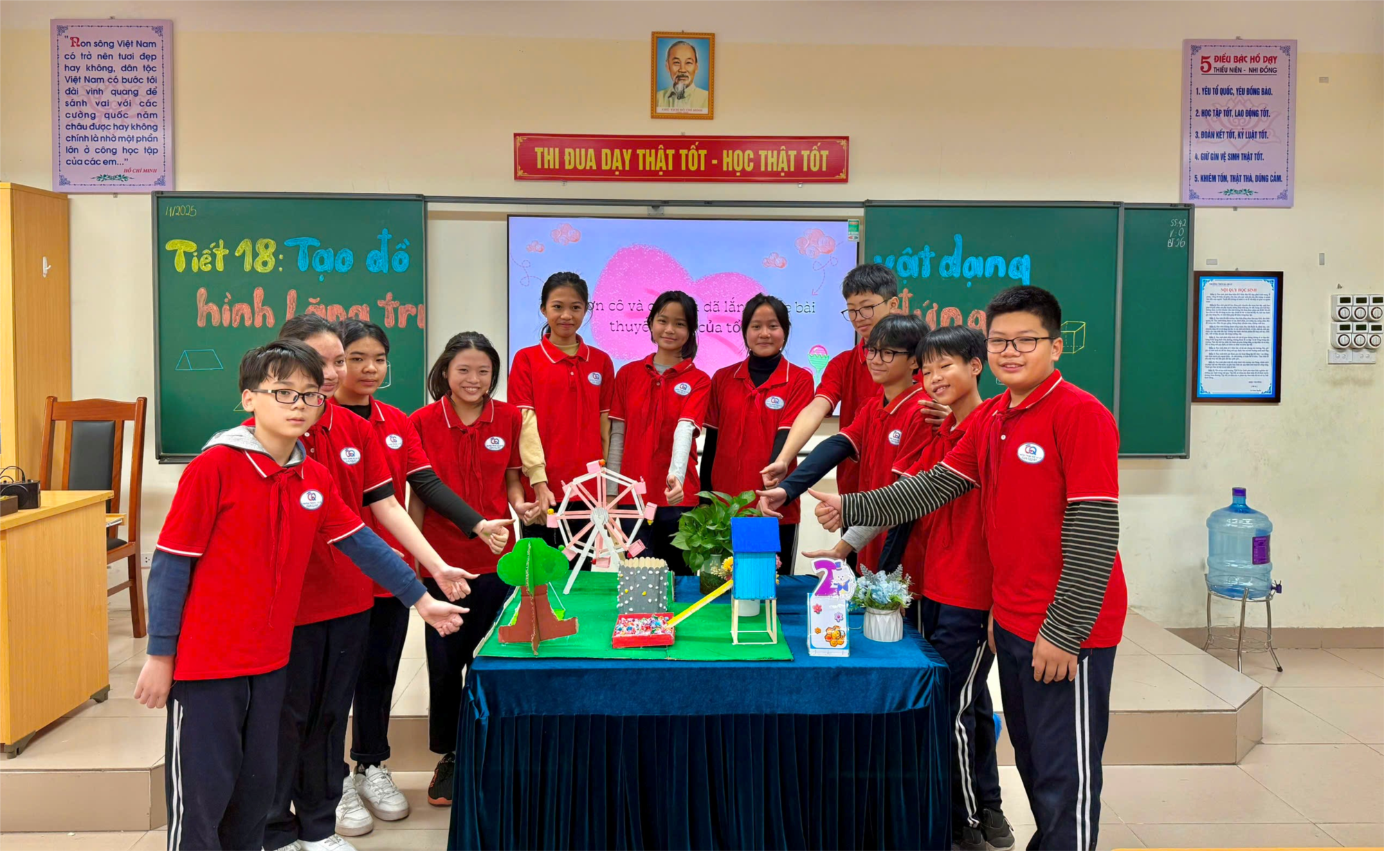 Tiết dạy của cô giáo Nguyễn Thị Vân Anh tại lớp 7A3 không còn là giờ học lý thuyết thông thường, thay vào đó, các em học sinh đã được bước vào một thế giới sáng tạo, nơi kiến thức về hình lăng trụ đứng không chỉ nằm trên giấy mà sẽ hóa thân thành những sản phẩm thực tế. Với sự dẫn dắt của cô, các em không chỉ hiểu sâu hơn về hình học mà còn tự mình ứng dụng để tạo ra những đồ dùng ý nghĩa. Đây là một hoạt động sáng tạo và gần gũi, giúp học sinh vừa củng cố kiến thức hình học vừa ứng dụng vào thực tế một cách thiết thực.